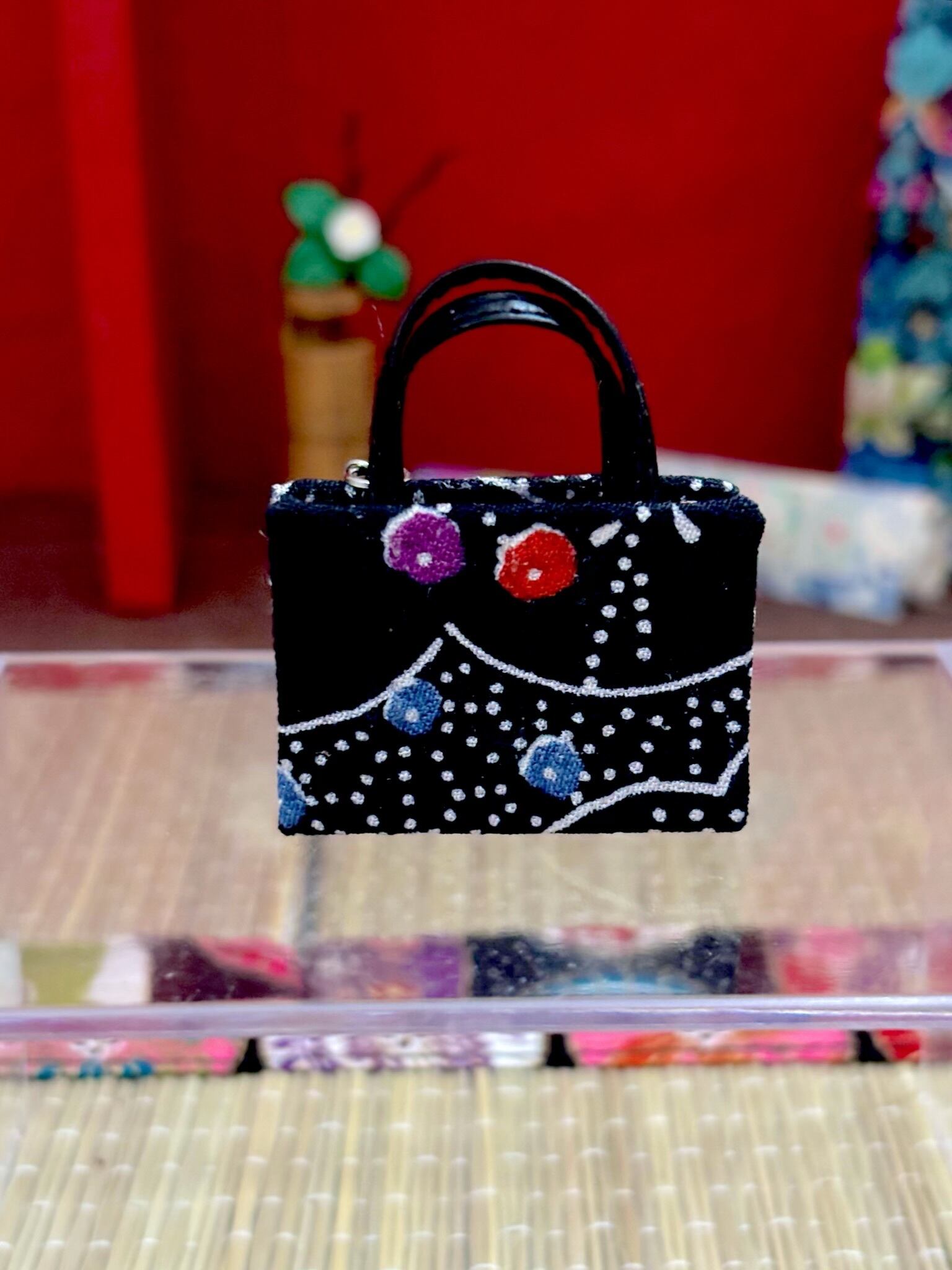 華やかな和の雰囲気を纏う「正絹 絞りの利休バック」が新登場!美しい正絹で仕立てられたこの利休バックは、ミニチュアサイズながらも贅沢な和装のエッセンスをしっかりと表現しています。伝統的な絞り模様が施されており、正絹の小紋の着物から生まれた高級感を放っています♪