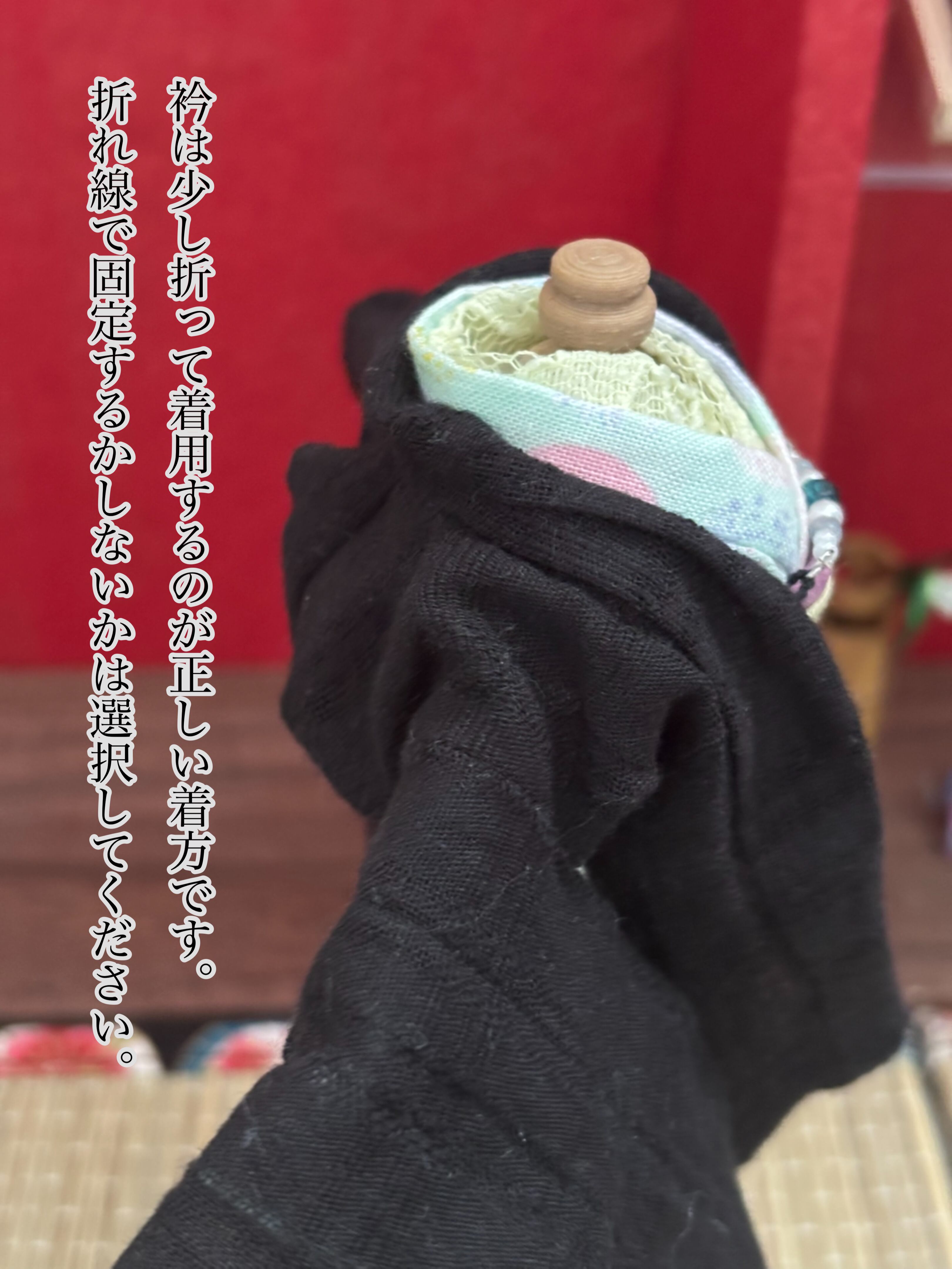 本格的に着せるなら後ろ衿は半分折って着せるのが人間界のルールですが、ドール界は特に拘らずに好きに着せてあげて下さい♪